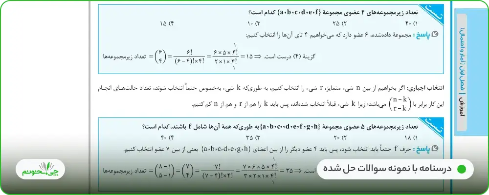 قدم دوم در استفاده از مطالب آموزشی این کتاب، خواندن درسنامههای آن است. در این کتاب، چیدمان درسنامهها، تقریبا با کتاب درسی یکی است اما فصل یک در آن به جای تقسیمبندی به سه درس، به پنج درس «اصول شمارش»، «تبدیل – ترکیب»، «احتمال (1)»، «احتمال (2)» و «چرخه آمار در حل مسائل»، تبدیل شده است.