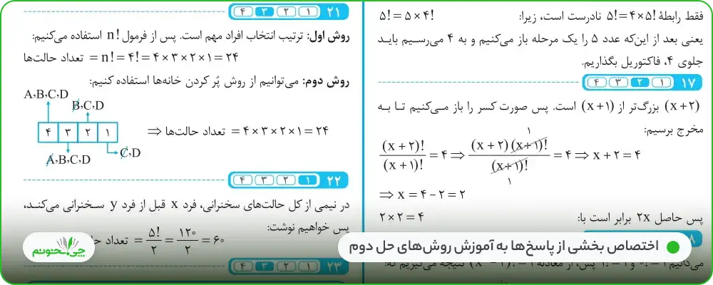 در پاسخنامه سوالات تشریحی این کتاب هم چندین روش برای حل سوالات نوشته شده و به نکات مهم، اشاره میشود در مواردی هم به سوالات متداول دانشآموزان با یک طرح گرافیکی از یک پسربچه و با فونتی متفاوت و رنگی، پاسخ داده میشود.