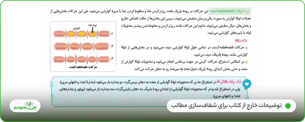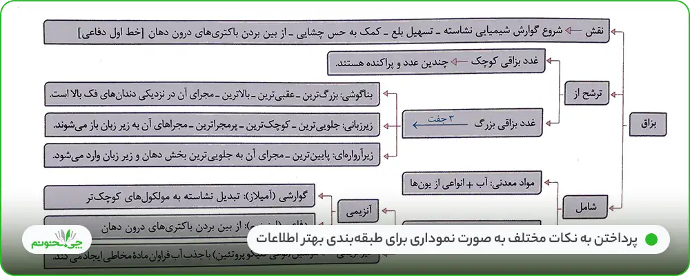 در هر فصل، مولفان کتاب، گفتارها را نوشته، زیر جملات و کلمات مهمتر خط کشیده و آنها را هایلایت کرده و نکات متعددی هم به متن، اضافه کردهاند. در حاشیهها هم بعضی نکات و جملات مهمتر به صورت ساده یا در کادرهایی با عناوین «نکته» و «کنکور» نوشته شده و در کادرهای کنکوری، شناسنامه مربوط به هر نکته هم نوشته شده است.
