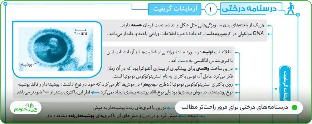 در درسنامه هر فصل، مطالب به صورت جدولی، نموداری و به خلاصهترین حالت ممکن نوشته شدهاند تا کار جمعبندی و مرور مطالب را برای داوطلبان کنکور تجربی، آسانتر کنند. در این کتاب همچنین تصاویر کتاب درسی نیز آورده شده و مهمترین نکات مربوط به هر تصویر، در کادر «نکات شکل» نوشته شده است.