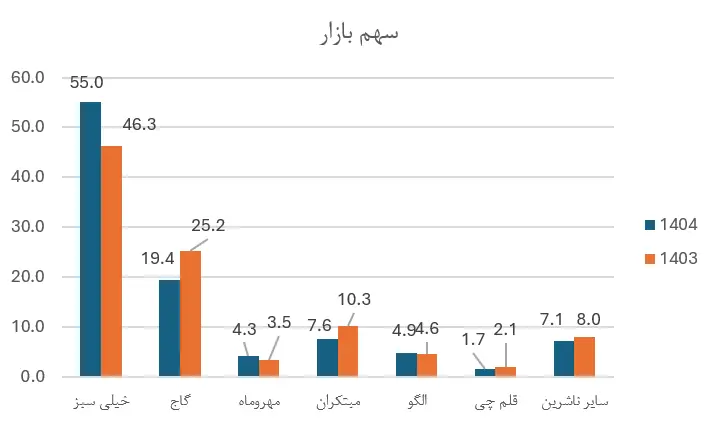 در نمودار زیر، سهم بازار ناشرین را مهر 1404 را در قیاس با مهر 1403، به شکل یک نمودار میله‌ای می‌بینید: