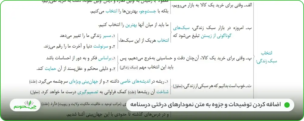 در واقع بخش درسنامه این کتاب، با استفاده از نمودارهای درختی، تنظیم شده و هر بخش از متن کتاب، با یک دستهبندی دقیق و منظم، نوشته شده است.