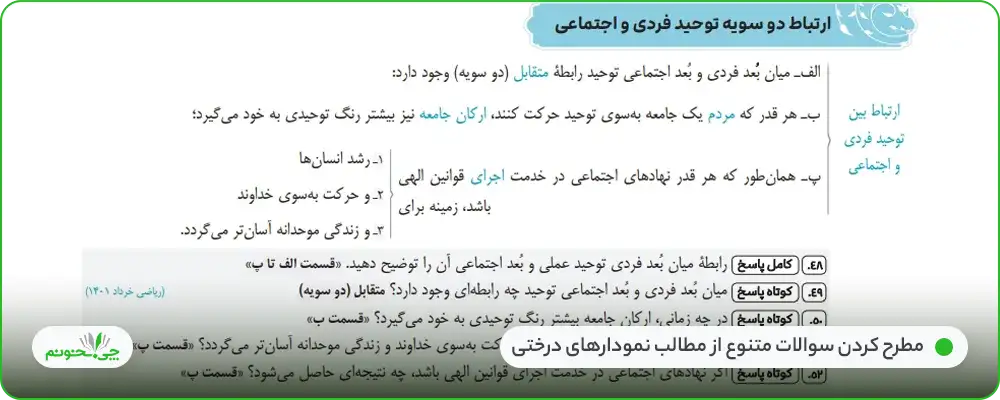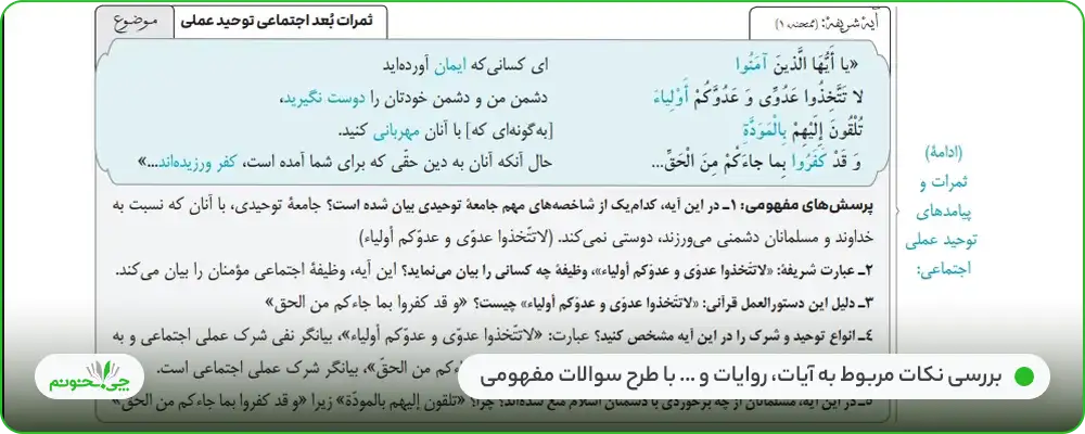 یکی از نکاتی که باعث تعاملیتر شدن محتوای درسنامههای این کتاب، میشود، طرح کردن سوال از محتوای آموزشی کادرهای مربوط به ابیات، آیات، روایات، احادیث و … است. از این کادرها، سوالاتی با عنوان «مفهومی»، مطرح شده و در همان بخش به صورت تشریحی، پاسخ داده شدهاند.