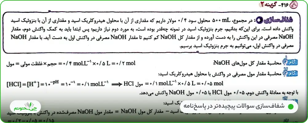 همچنین کتاب از روند آموزشی خوبی در بخش درسنامه برخوردار است. به عنوان مثال در فصل یک کتاب (اسید و بازها)، درسنامه برای درک هرچه بهتر دانشآموزان از مبحث «تعادل و ثابتهای تعادل و اسیدی»، به آموزش مباحث تعادل و یک آزمایش آموزنده برای تعادل پرداخته است.