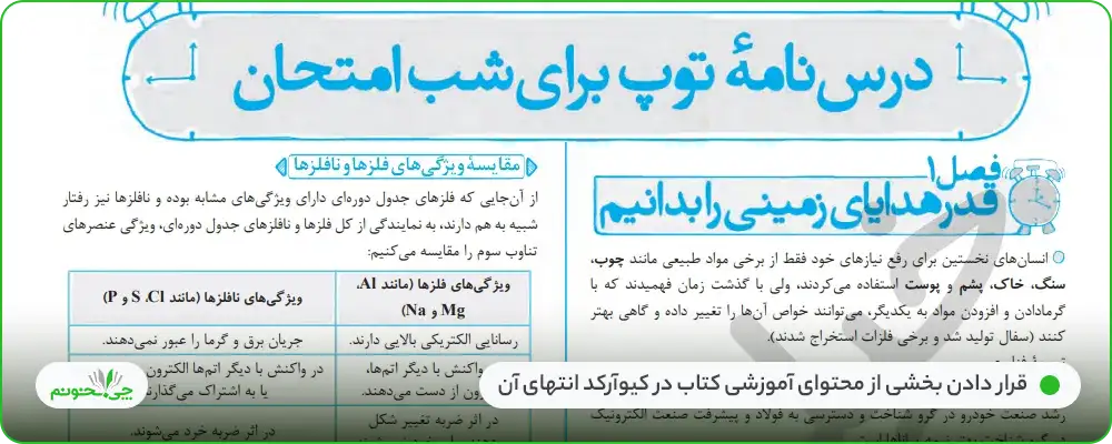 در درسنامههای این کتاب، برای محکمکاری، حتی بخشهایی که گفته شده در کنکور، مورد سوال قرار نمیگیرند هم پوشش داده میشود! مثلا «جدول ژانت» گفته شده که در کنکور مطرح نمیشود و مولف این کتاب گفته که قرار است سوالاتی از آن در کیوآرکد ابتدای کتاب، قرار داده شود. البته این کیوآرکد روی جلد انتهای کتاب قرار داده شده و محتوای آموزشی خلاصهای دارد که شامل آزمون جامع فصل نمیشود. همچنین برای بخش «شیموفیلها بخوانند» نیز مطلبی در این کیوآرکد قرار داده نشده است.