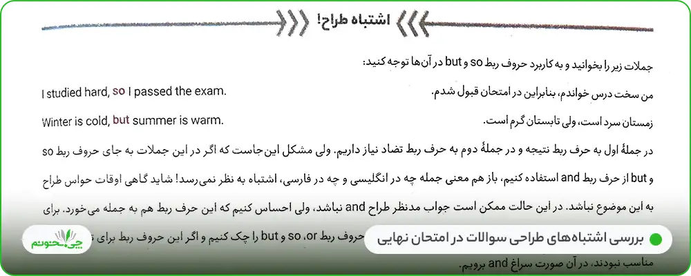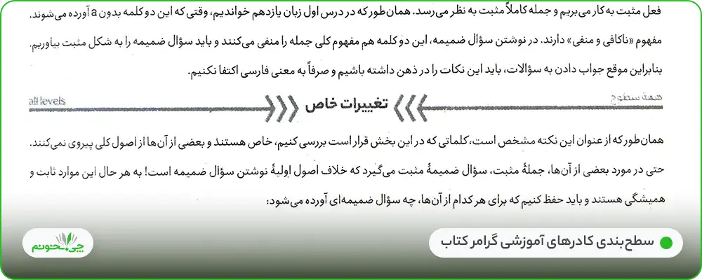پیش از سوالات گرامر، شنیداری و نگارش هر درس هم توضیحاتی در مورد محتوای کلی و نوع سوالات، اهمیت آن‌ها و روش مطالعه برای آمادگی بیشتر برای پاسخ‌گویی به هر دسته از این سوالات، نوشته شده است.