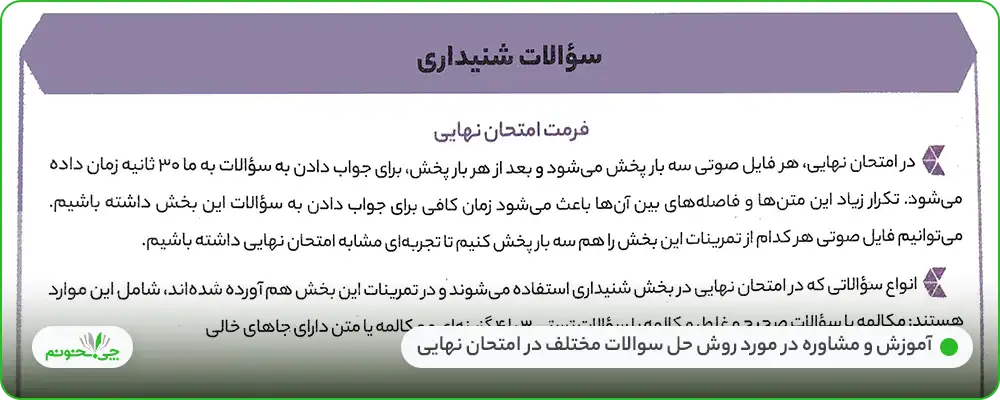 این مشاوره‌ها در ابتدای بخش اول سوالات شنیداری نیز قرار گرفته‌اند؛ در این بخش، در مورد نحوه اجرای سوالات شنیداری در امتحان نهایی و روش مطالعه کتاب درسی برای آمادگی بیشتر در برابر سوالات شنیداری توضیح داده می‌شود.