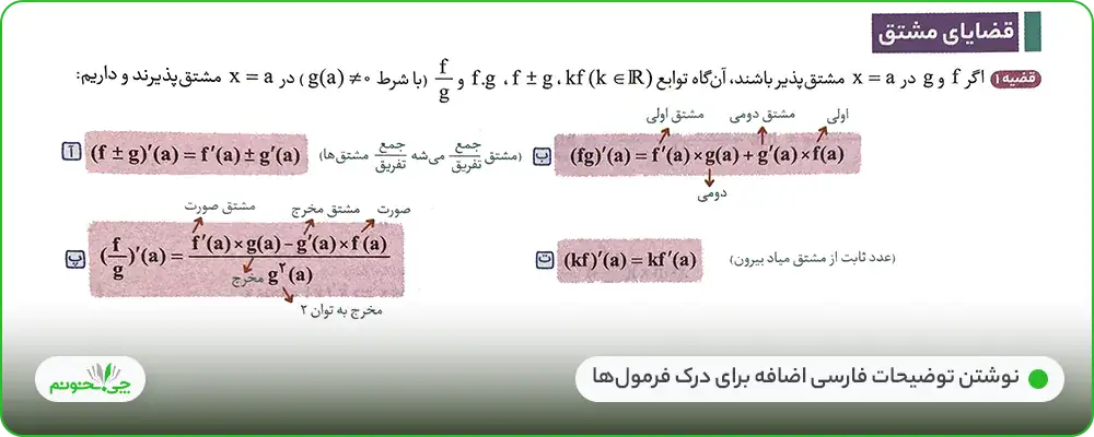این درسنامهها برای آموزش سادهتر بعضی بخشها، از انواع فلش و نوشتن توضیحات اضافه، استفاده کردهاند؛ برای مثال در صفحه 82 و برای آموزش قضایای مشتق، برای هر یک از فرمولهای مربوط به قضیه 1، توضیحات فارسی اضافه، نوشته شده است.