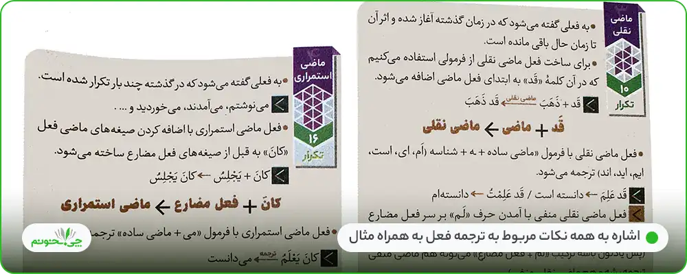 در قسمت اول از بخش اول که درسنامههای مربوط به ترجمه فعل را در برمیگیرد، سوالاتی برای تمرین مطالب آموزشی با عنوان «ایستگاه سوال» قرار گرفته که پاسخ تشریحیشان نیز در همان کادر، نوشته شده است. قسمت سوم این بخش هم شامل 96 سوال تشریحی و ترکیبی بارمدار از امتحانات نهایی اخیر (دی 1400 تا خارج خرداد 1404) است.