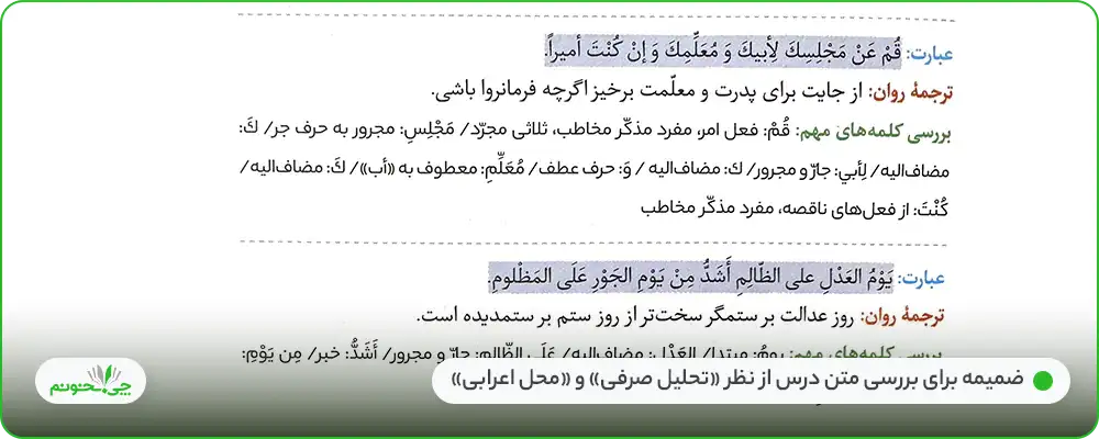 قسمت پنجم دارای دو بخش است که بخش اول آن تنها به آموزش تحلیل صرفی و بخش دوم به محل اعرابی، اختصاص داده شده است؛ بخش اول، نکات مربوط به ویژگیهای فردی انواع کلمه (اسم، فعل و حرف) و جزئیات ویژگیهای هر یک از کلمات (مثل نحوه تشخیص جنس یا وزن اسم و معلوم و مجهول بودن فعل) به همراه مثال را در خود جای میدهد. بخش دوم هم شامل آموزش مربوط به ویژگیهای هر یک از نقشهای کلمات مثل فاعل، مفعول، مبتدا، خبر و ... و روش تشخیص سریعتر هر یک و انواع مثال، میشود.