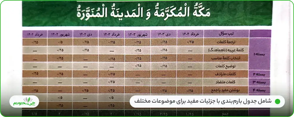ویدیوهای آموزشی تخصصی و ضمیمه بامحتوای این کتاب، از ابتکارات مولفان آن، به حساب میآیند. این کتاب، به آموزش درس عربی، با رویکردی متفاوتتر، پرداخته و مطالعه آن همگام با آموزش کلاس درسی، برای آمادگی در برابر امتحانات داخلی و نهایی، پیشنهاد میشود.