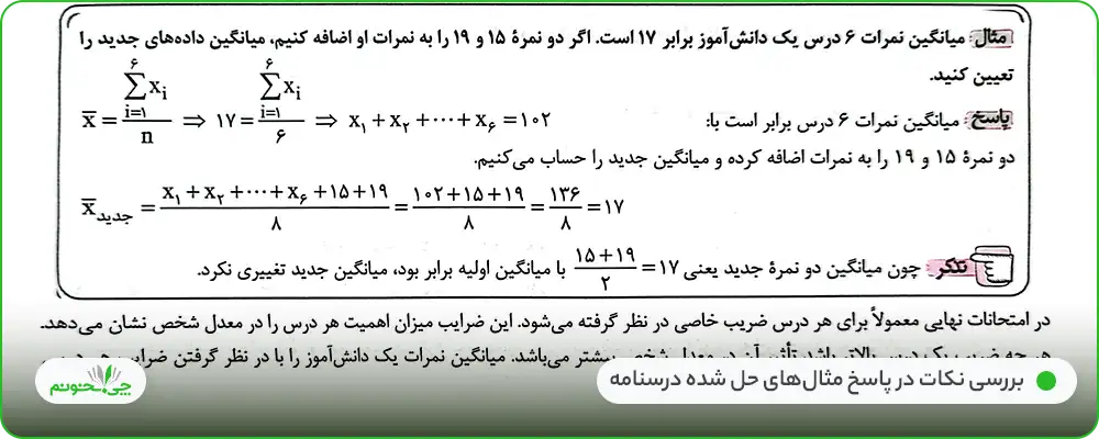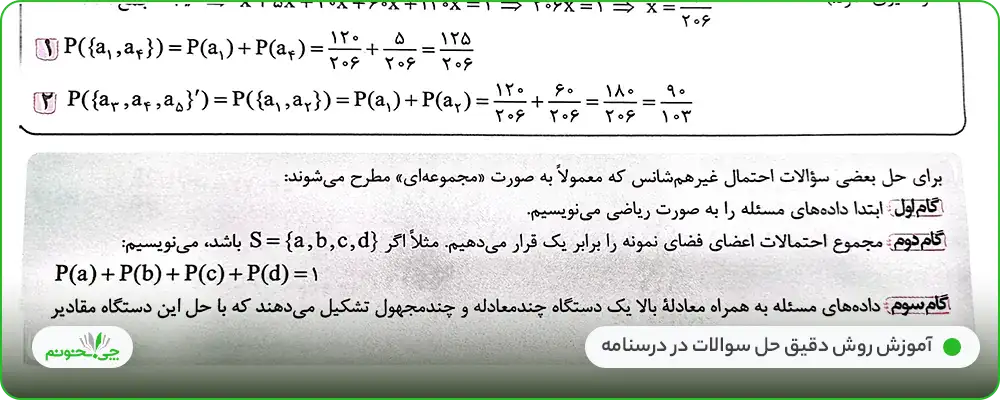 از دیگر ویژگیهای مثبت درسنامههای این کتاب، میتوان به آموزش روش حل سریع بعضی سوالات، مثل «محاسبه میانگین اعداد بزرگ» در صفحه 100 و آموزش گام به گام گروهی دیگر از پرسشها مثل «بعضی از سوالات احتمال غیر همشانس که معمولا به صورت مجموعهای مطرح میشود.» در صفحه 57، اشاره کرد.