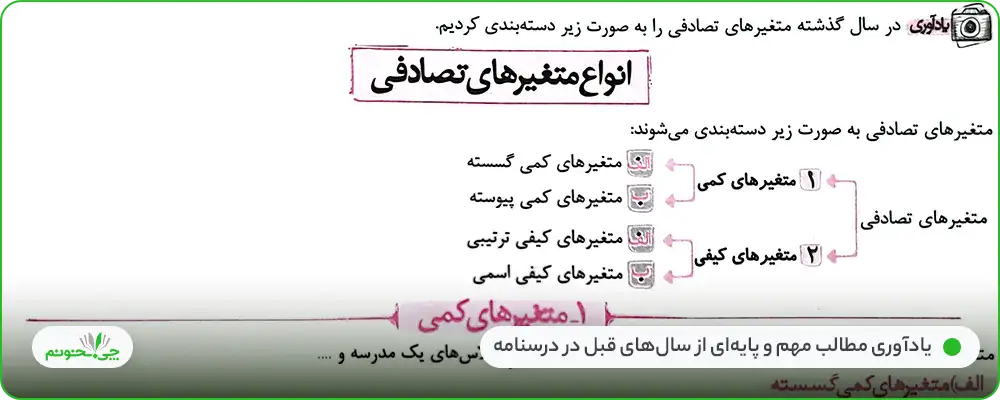 از نکات مثبت درسنامهها، بخشهایی است که با عنوان «یادآوری»، علامت زده شدهاند. این قسمتها به یادآوری نکاتی میپردازد که یادگیریشان، پیش از فراگیری مطالب جدیدتر، ضروری است؛ برای مثال انواع دستهبندی متغیرهای تصادفی در فصل آمار توصیفی، بررسی شدهاند.