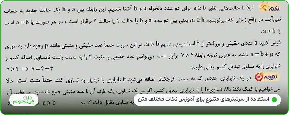 توضیحات درس‌نامه، تناقضی با توضیحات کتاب درسی ندارند، بلکه در بسیاری از موارد کامل‌کننده آن هستند. هرچند توصیه می‌شود مخاطب ابتدا مفاهیم اولیه و اساسی را در کلاس درس و از دبیر محترم خود بیاموزد. البته باید گفت که دانش‌آموزانی که به هر صورت امکان حضور در کلاس را ندارند به‌راحتی می‌توانند با استفاده از این درس‌نامه‌ها خود را به سطح کلاس درس برسانند.