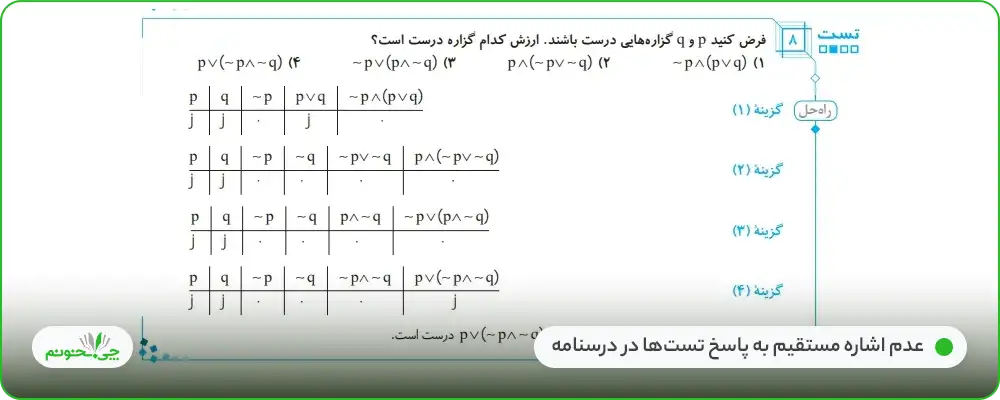 چینش تستها هم کاملا حرفهای و قابل تقدیر است. چینش تستها هم به ترتیب مطالب است و هم از ساده به سخت مرتب شدهاند که روند پاسخگویی به آنها را برای دانشآموزان راحتتر خواهد کرد. تعداد تستهای نیز کاملا مناسب و منطقی هستند و تمام دانشآموزان را از منابع دیگری بینیاز خواهند کرد. همچنین نسبت تستهای تالیفی به تستهای کنکور در تمامی مباحث به خوبی رعایت شده است. البته به جز در مواردی که مباحث آموزشی کتاب نظام جدید آمدهاند؛ برای آنها، هنوز تستهای کنکوری، اضافه نشده است. (برای مثال منطق گزارهها– برآورد)