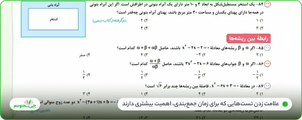 همان طور که در مقدمه مولف ذکر شده اگر خواننده این کتاب کمک درسی، زمان محدودی دارد میتواند ابتدا تستهایی را که ایموجی قرمز دارند، حل کند و در صورت داشتن وقت بیشتر، بقیه تستها را برای تمرین بیشتر و افزایش سرعت و مهارتش در حل تست حل کند. در پایان تستهای هر درس، بخشی تحت عنوان سری Z قرار گرفتهاند که تستهای سختی و چالشی در میان آنها کم نیست. این تستها برای دانشآموزان با سطح بالاتر مناسباند و لزومی ندارد در زمان شروع یادگیری حل شوند.