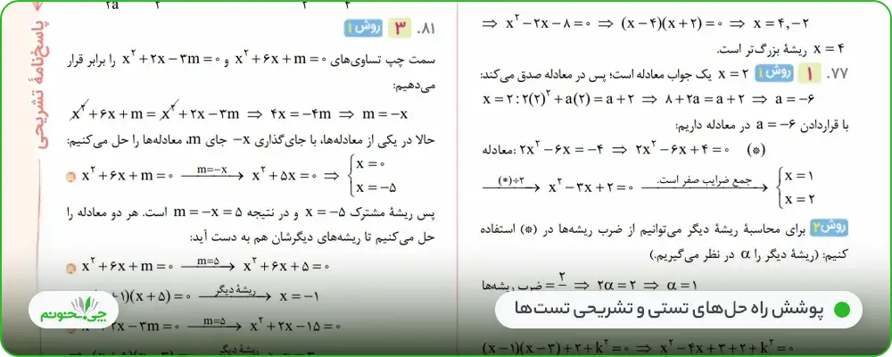 - در مورد معادلات دومجذوری نیز به نکات بیشتری از جمله مجموع ریشهها و … میشد اشاره کرد.