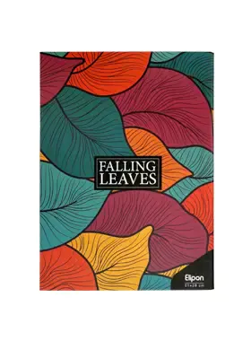 - نقشی از برگهای بزرگ زرد، نارنجی، زرشکی، سبز پررنگ و سبز کمرنگ که به زیبایی روی یکدیگر قرار گرفتهاند و نوشته FALLING LEAVES
