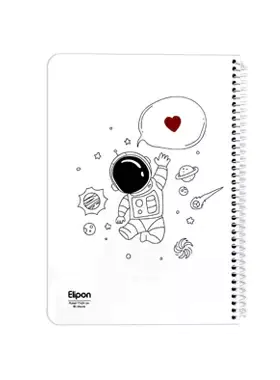 دفتر ۸۰ برگ الیپون صحافی فنر مورب از کنار و قطع وزیری دارد و برگههای آن با ابعاد ۱۷*۲۴ ساخته شدهاند. جلد این دفتر از نوع گلاسه با وزن ۳۰۰ گرم ساخته شده و روی آن با طرح زیبای رنگی و شبیه به سهبعدی طرح فضانورد چاپ شده است.