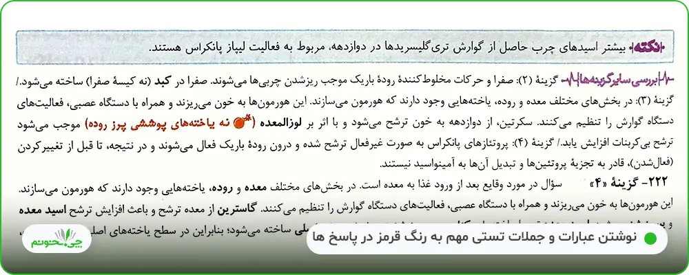 در نوشتن پاسخ بعضی از سوالات، برای تاکید بر اهمیت بعضی عبارات و جملات، آن‌ها را در پرانتز، به رنگ قرمز و با علامت بمب، نوشته‌اند. این جملات که از مهم‌ترین نکات تستی پاسخ سوالات، به حساب می‌آیند، از تله‌های تستی‌ای هستند که در سوالات، به صورت‌های مختلف، مورد پرسش قرار می‌گیرند.