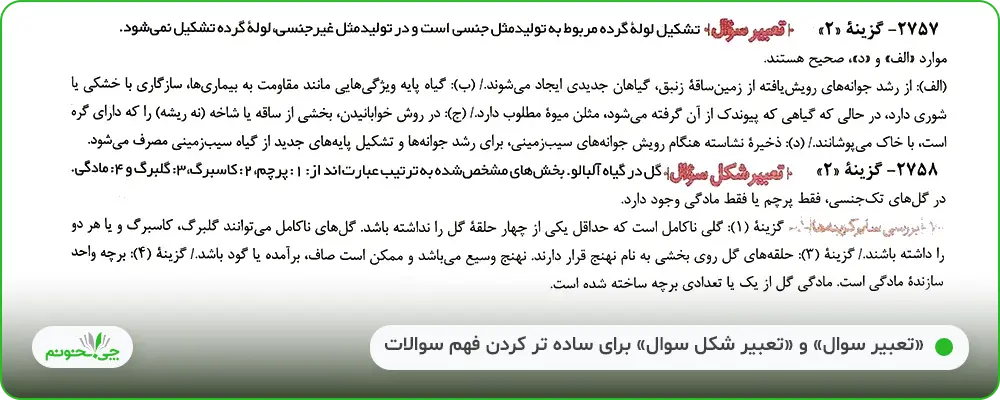 بهتر بود این دو سرتیتر پیش از اشاره به گزینه صحیح، قرار می‌گرفتند تا دانش‌آموز بتواند قبل از دیدن جواب، با خواندن این نکات، وقت بیشتری برای فکر کردن روی سوال و پیدا کردن جواب آن، بگذارد.