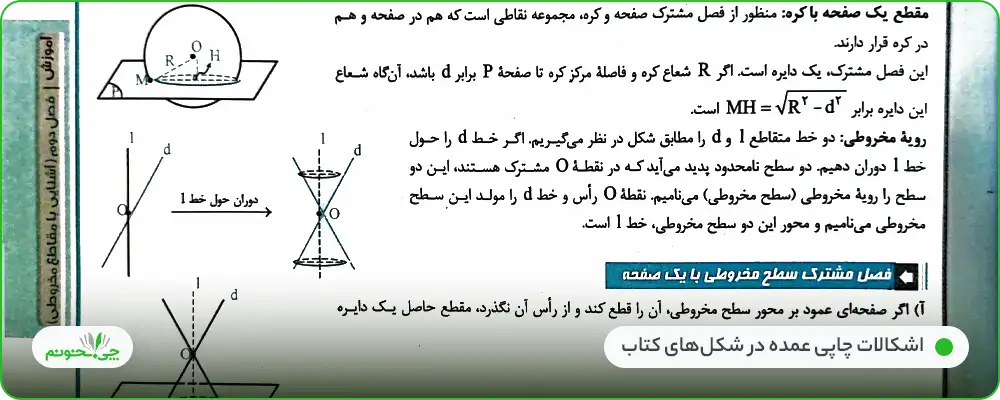 با توجه به اینکه درسنامه این کتاب باید پاسخگوی نیاز دانشآموزان در حل تستهای کنکور نیز باشد، اما این موضوع در آن، لحاظ نشده است. متن درسنامه تا حدی ناقص است و مطالبی نظیر دایره آپولونیوسو یا بیضی و ویژگیها که البته این نقص با تستهایی که در متن درسنامه آمده، تا حد زیادی پوشانده شده است.