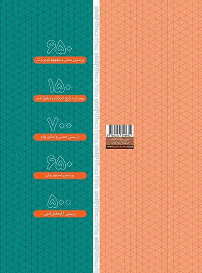 بخش اول دستور زبان (قلمرو زبانی 4 نمره)، بخش دوم آرایههای ادبی (قلمرو ادبی 3 نمره)، بخش سوم معنی و املای واژه (قلمرو زبانی 3 نمره) و بخش چهارم معنی و مفهوم شعر و نثر (قلمرو فکری 8 نمره) + تاریخ ادبیات و حفظ شعر (قلمرو ادبی 2 نمره).