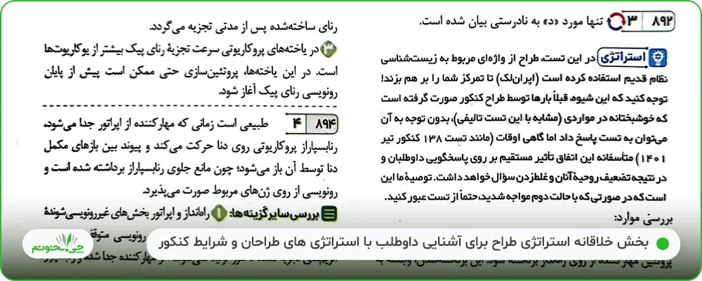 از دیگر بخشهای جالب پاسخنامه، «استراتژی طراح» است که در آن، همه ترفندهای طراحان کنکور برای تضعیف روحیه یا پرت کردن حواس داوطلبان! (مثل شروع تستها با یک سوال بیجواب یا بیش از حد سخت یا قرار دادن 7، 8 تست سخت پشت سر هم) در آزمونها، تشریح و توضیح داده شده و در آزمونهای این کتاب هم به صورت مکرر مورد استفاده قرار میگیرند. این استراتژیها به آمادگی ذهنی بیشتر دانشآموزان برای شرکت در جلسه کنکور، کمک شایانی میکنند.