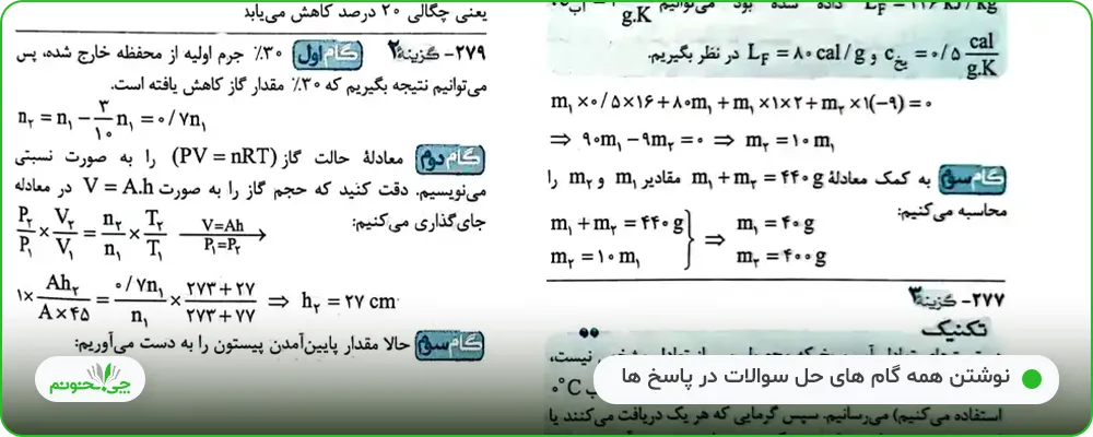 پاسخ تشریحی تستها بسیار خوب و قابل فهم نوشته شدهاند، راه حل سوالات سخت به چند مرحله تقسیم شده است و هر مرحله به طور مفصل توضیح داده شده است. برای برخی از تستها نیز دو راه حل متفاوت ارائه شده است.