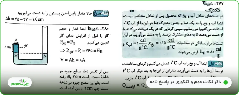 در بخش پاسخ تشریحی کادرهای آبی رنگی وجود دارد، که شامل نکتههای خاص و کنکوری است و دانشآموزان با استفاده از این نکات میتوانند تستها را بسیار سریعتر حل کنند.