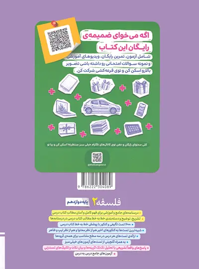 کتاب پرسش‌های چهارگزینه‌ای فلسفه دوازدهم خیلی سبز به بررسی خط به خط کتاب درسی پرداخته و بیش از 950 تست را تحلیل کرده است. این جامعیت باعث می‌شود که دانش‌آموزان با خیال راحت از کتاب برای آمادگی امتحان نهایی و کنکور استفاده کنند. لحن کتاب رسمی است و در بعضی قسمت‌ها برای توضیح بیشتر محاوره‌ای می‌شود. در فهرست نام هر درس به‌اضافه شماره صفحه درسنامه و تست نوشته شده است. بعد از توضیح درسنامه سریع به سراغ زدن تست می‌رویم که به تفهیم مطالب کمک می‌کند. در بخش پایانی فهرست هم پاسخنامه تشریحی و کلیدی قرار دارد. در ادامه به بررسی کتاب فلسفه دوازدهم تست خیلی سبز اثر حمید سودیان طهرانی و محمد جواد سه‌دهی می‌پردازیم. طرح جلد کتاب فلسفه 12 تست خیلی سبز ساده اما مفهومی است. این کتاب با کاغذ سفید و در قطع رحلی چاپ شده است. ترکیب رنگ به کار رفته در متن طوسی و صورتی می‌باشد. تنها تصویر کتاب، چهره دو فیلسوف است که در ابتدای هر درس می‌بینیم. فونت و فاصله بین خطوط به‌خوبی رعایت شده است. در مجموع کتاب از نظر ظاهری دارای جذابیت خاصی نیست و بیشتر بر ارائه محتوای غنی تکیه دارد. کتاب فلسفه دوازدهم تست خیلی سبز با داشتن درسنامه خط به خط کتاب درسی و بانک تست جامع می‌تواند به‌عنوان منبع اصلی برای امتحان‌ نهایی و کنکور طی سال تحصیلی استفاده شود. ارائه مطالب در قالب جدول و نمودار، داشتن خلاصه درس، افزودن بخش از نگاه طراح برای آشنایی با دیدگاه طراحان سؤالات کنکور و نیز آوردن تست‌های کمی دشوارتر، مهم‌ترین نوآوری‌های این کتاب است. پیش از خرید اینترنتی کتاب فلسفه دوازدهم تست خیلی سبز ادامۀ مطلب را مطالعه کنید.