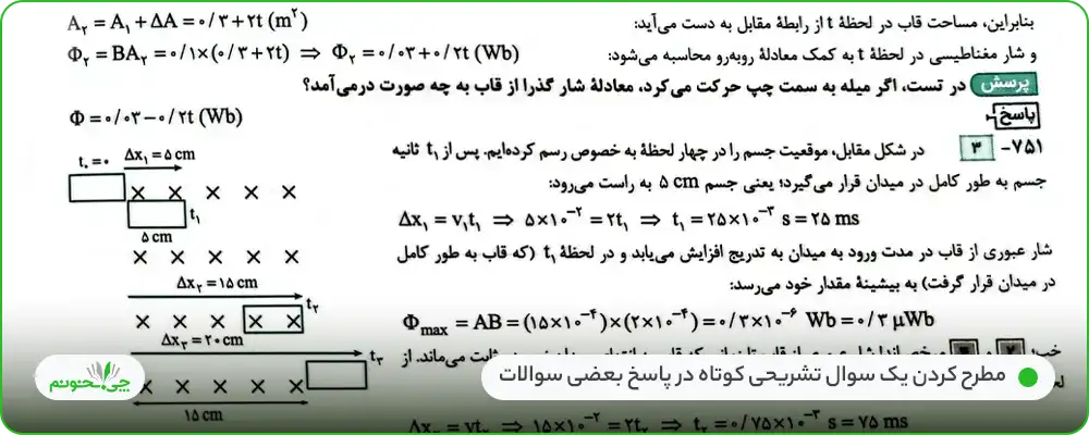 در پاسخ تشریحی بعضی سوالات هم یک سوال تشریحی دیگر هم مطرح شده تا ذهن دانشآموز، بیشتر به کار گرفته شود. نکات مهمتر بعضی تستها هم تحت عنوان «توجه»، نوشته شدهاند. همچنین قسمتهایی تحت عنوان تیز باش وجود دارد که راه حل سریعتر را بیان کرده است.