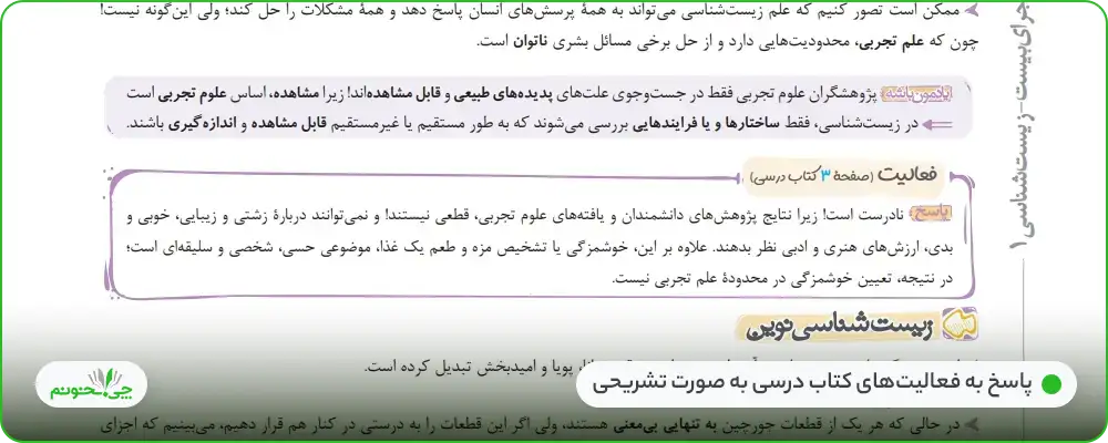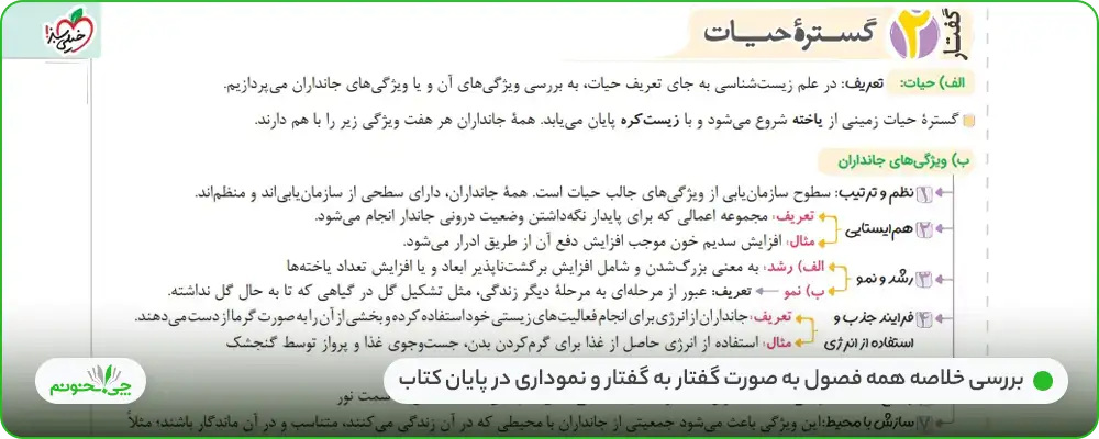 متن کتاب درسی رو کاملا بدون کم و کاست دارد و اشکال کتاب درسی را در قالب کادرهایی با نام >> از شکل چی میفهمیم<< کاملا واکاوی مینماید تمام فعالیتهای کتاب درسی را پاسخ میدهد و در آخر سوالات تشریحی و امتحانی و تستی می آورد به همراه پاسخ تشریحی برای آن دسته از افرادی که زیست شناسی ضعیفی دارند و یا تغییر رشته ای از ریاضی و انسانی و … به تجربی میباشند بسیار مناسب است