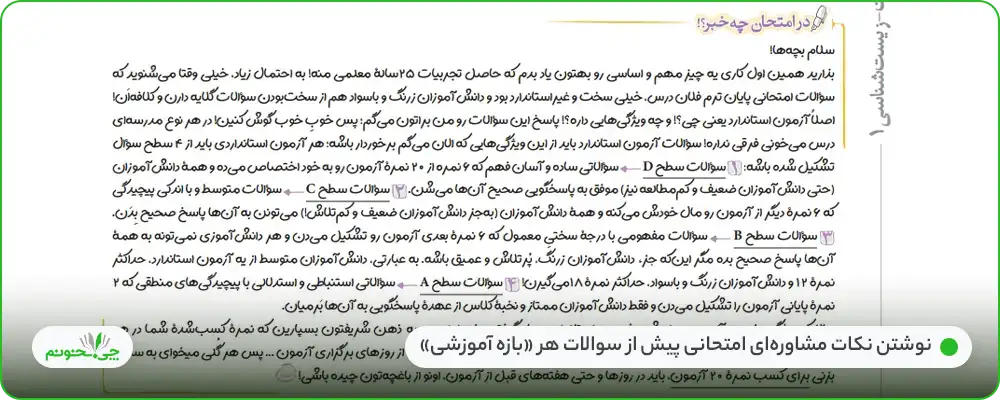 از ویژگیهای مثبت این کتاب، نکات مشاورهای قبل از سوالات امتحانی آن است که در کادر «در امتحان چه خبر؟!» نوشته شده و در آن به مهمترین و سختترین قسمتهای هر گفتار و فصل که باید مورد توجه بیشتری قرار گیرند، اشاره میشود.