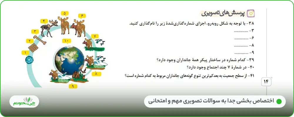 با توجه به اهمیت فراوان شکلها و تصاویر کتاب درسی، به این سوالات توجه ویژهای شده و یک بخش جدا به سوالات تصویری هر «بازه آموزشی»، اختصاص داده شده است. بهعنوان مثال؛ در فصل تبادلات گازی، حدود 50% سوالات، از تصاویر مطرح شده است. با وجود اینکه با مطالعه درسنامهها میتوان به اغلب سوالات پاسخ صحیح داد، اما برای پاسخ دهی به برخی از پرسشها، نیاز به تجزیه و تحلیل بیشتری وجود دارد.