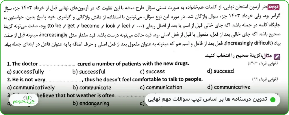 بخش بعدی سوالات، بعد از درسنامه آموزشی گرامر قرار دارد که با توجه به نوع گرامر درس، میتواند دربرگیرنده تیپهای سوالی متنوعی باشد؛ مثل نوشتن شکل صحیح فعلهای داخل پرانتز در جای خالی، نوشتن جمله کامل با گروه کلمات داده شده، کامل کردن جمله با استفاده از دانش گرامری خود، پیدا کردن اشتباهها در جملات و تصحیح آنها، پاسخ دادن به سوالات با توجه به تصویر، پر کردن جای خالی جمله با توجه به مفهوم جمله داده شده، تغییر جملات با توجه به گرامر داده شده، تستهای جمعبندی و ... .