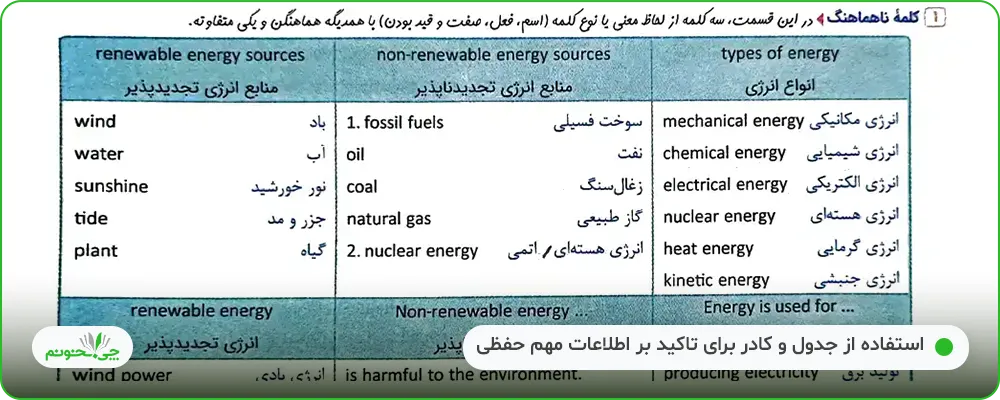 هر درسنامه، با واژگان پایه شروع میشود؛ این واژهها، کلمات مهمی هستند که از قبل، آموختهاید و در این درس هم تکرار شدهاند. بعد واژگان سطر به سطر کتاب دانشآموز و بعد از آن، واژگان سطر به سطر کتاب کار، نوشته شده است.