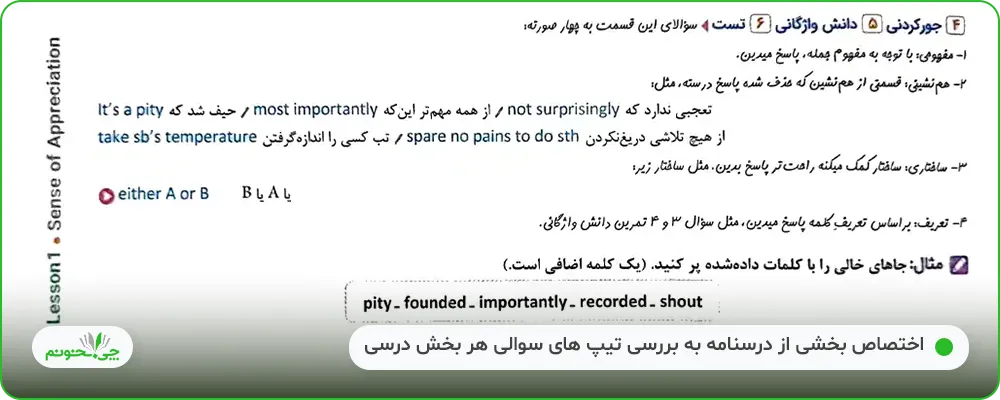 بخش بعدی به سوالات «خواندن» اختصاص یافته و در آن، از متنهای کتاب درسی، سوالات مرتبط مطرح کرده است. بعد از آن، سوالات تستی با عنوان «درک جمله» نوشته شده و متنهای درک مطلب با سری سوالات «درست/نادرست»، «چهارگزینهای» و «پاسخ به سوالات به صورت تشریحی» آمدهاند. در این بخش، سوالات کلوز تست نیز جای داده شدهاند.