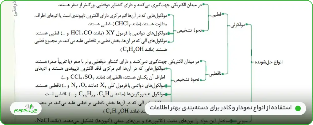 در لابهلای متن این کتاب شاهد بخشها و کادرهای متفاوتی هستیم که «توجه»، «تعریف»، «ترفند»، «چند نکته مهم» و «یادآوری» نام دارند. این کادرها و نمودارها، روند آموزش بخشهای طولانیتر و مبهمتر کتاب درسی را بسیار سادهتر و سریعتر میکنند. در پایان هر درس هم کادر کوتاهی با عنوان «جمعبندی» نوشته شده که نکات مهمتر را به صورت خلاصه، بیان میکند.