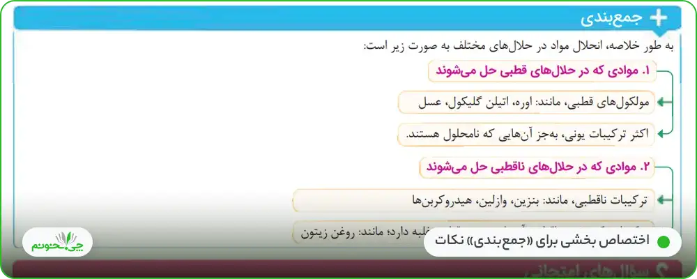 به عنوان مثال، در بخش «میزان اسیدی بودن محلولها (قدرت اسیدی)»، تمام نکات سه تیپ مختلف سوالات تشریحی این بخش که ممکن است در امتحانات نهایی از آنها سوال بیاید، مورد بررسی قرارگرفتهاست که عبارتند از: