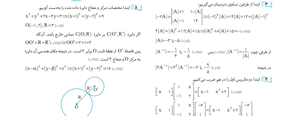 در پایان کتاب، پاسخ تشریحی سوالات این کتاب، نوشته شده است. این پاسخ‌ها هم بارم‌بندی شده بوده و در بعضی از سوالات، به راه حل دوم نیز، اشاره شده است. با اینکه نوشتن دلیل نادرست بودن سوالات درست / نادرست، در امتحانات مورد پرسش قرار نمی‌گیرد، بهتر بود این مورد هم نوشته می‌شد تا گرهی در ذهن دانش‌آموز در این باره باقی نماند.