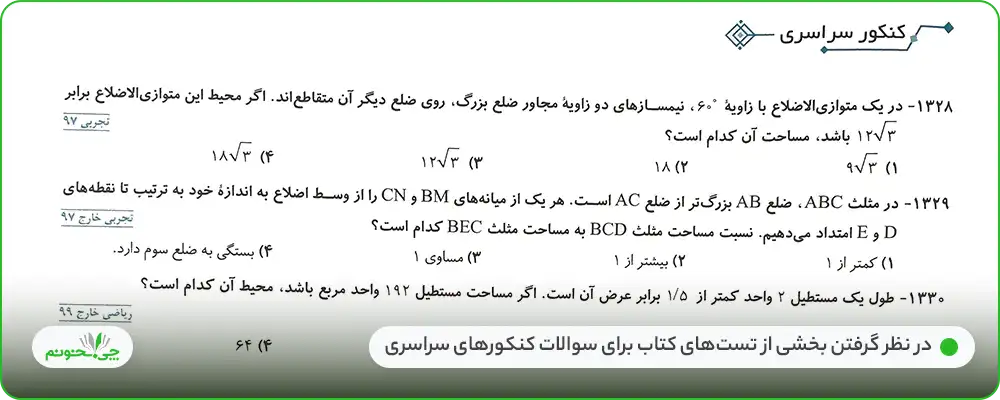 البته باید گفت که حل کردن تستهای بالاتر از سطح کتاب و کنکور سراسری این کتاب، در درس هندسه به دانشآموزان کمک خواهد کرد. چرا که ایدههای سختتر و حل مسائل پیچیدهتر نسبت به کنکور را میآموزند و در حل تستهای سادهتر، سریعتر عمل خواهند کرد. اما روند تستها، کاملا منطبق بر اهداف کتاب و کنکور است و مولفین از این مسیر خارج نشدهاند. پاسخهای تشریحی هم عالی و کامل هستند.