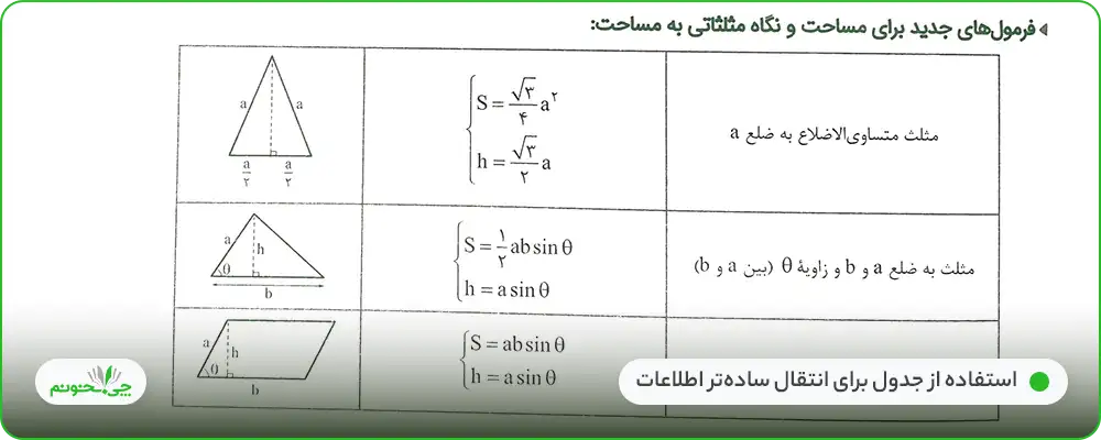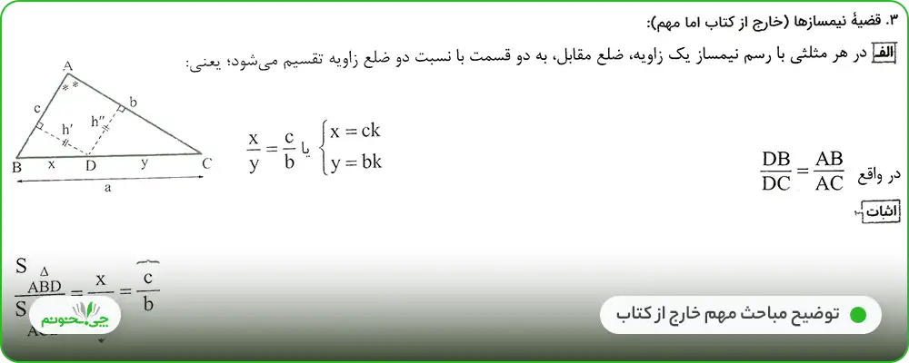 مباحث درسنامه بر اساس مطالبی که در متن و تمرینهای کتاب درسی هستند و مباحثی که در کنکور سراسری از آنها تست مطرح میشود، آورده شدهاند. درسنامه کتاب، به تنهایی کامل نیست و به قضایایی نظیر روابط طولی در مثلث تنها در سوالات تشریحی بها داده شده است، پس برای تکمیل بودن آنچه دانشآموز یاد میگیرد باید به تستها و سوالات کتاب نیز توجه کند.