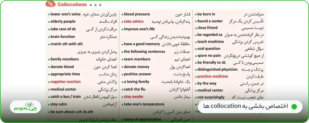 از نکات مثبت این کتاب این است که در هر بخش، بعد از نوشتن لغات مهم و معانی آنها، به Collocation های (لغات همنشین که در کنار هم، معنای جدیدی پیدا میکنند.) آن بخش هم اشاره میشود. یادگیری این لغات، علاوه بر آماده کردن دانشآموز برای سوالات مفهومیتر، دانش او را از زبان انگلیسی، عمیقتر میکند.