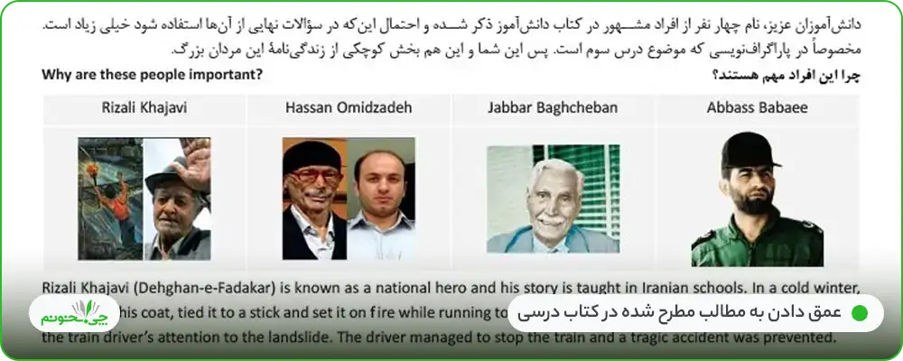 از دیگر نکات درسنامههای این کتاب، بسط دادن موضوعات مطرح شده در کتاب درسی است؛ برای مثال در درسنامه درس 1، علاوه بر اطلاعات محدودی که در تعدادی از افراد مشهور ایرانی، ذکر شده بود، اطلاعات بیشتر به همراه ترجمه، به دانشآموز داده شده تا در صورت مطرح شدن سوال از این بخش، آمادگی کافی داشته باشد.