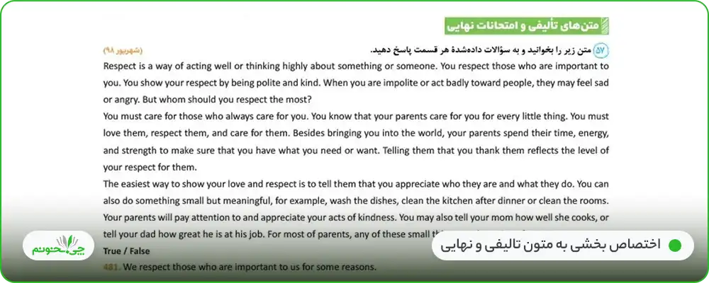 «سوالات امتحانی»، به نظر نمیرسد که دارای ساختار و دستهبندی مشخصی باشند؛ در اولین بخش از سوالات امتحانی، با سوال از واژگان Title Page، Get Ready و Conversation و لغات همنشین این بخشها، روبهرو میشویم. بعد از آن سوالات مربوط به واژگان New Words and Expressions، Reading و Vocabulary Development و همنشینهای آنها و بعد هم سوالات Reading کتاب درسی، نوشته شدهاند!