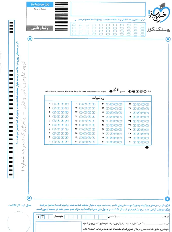 این دفترچه که سایز آن، نصف یک کاغذ A4 است، تنها چند ورق دارد و در آن پاسخهای کلیدی مربوط به هر یک از دفترچههای کنکور، نوشته شده است.کتابچه بوستر فیزیک شیمی ریاضی