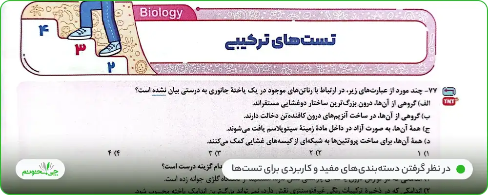 البته باید گفت که سوالات نوشته شده در دستهبندیهای مذکور، دارای علائمی هستند که اطلاعات اضافهتری در مورد هر تست، در اختیار دانشآموز، قرار میدهد؛ برای مثال نشان TNT، علامتی است که برای جدا کردن تستهای مهم و واجب برای حل و یادگیری نکات، در نظر گرفته شده است.