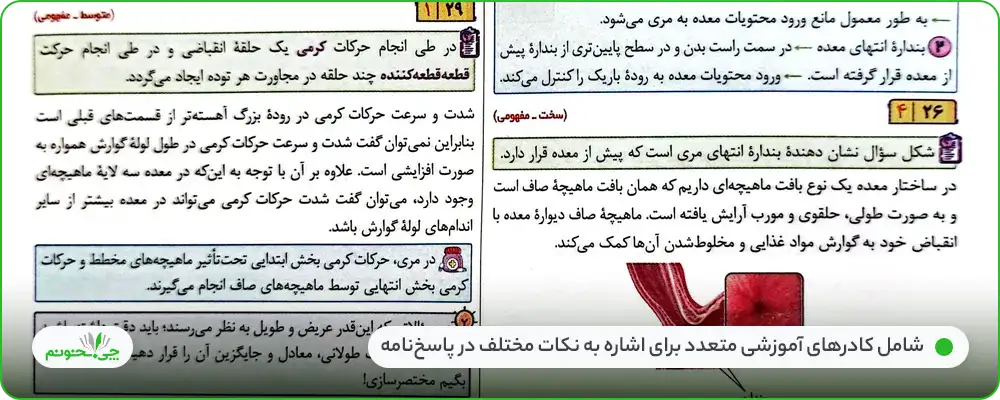 از دیگر نکات مثبت این کتاب، پاسخ تشریحی سوالات آن است. در این پاسخها، علاوه بر نوشتن علت نادرست بودن سایر گزینهها، مواردی مثل توضیح منظور سوال در «سوال چی میگه؟»، نکات مهم پاسخها در «نکته» و «تذکر»، استراتژی و تکنیکهای حل تست، جمعبندی نکات پاسخها در لب کلام، نکات ترکیبی، تلههای تستی، تحلیل تست کنکور، آشنایی با طرز تفکر طراحان، سوالات اضافه برای مرور نکات، مشاوره مولفان و ... نیز در پاسخها، نوشته شدهاند. سطحبندی تستها بر اساس درجه سختی هم در پاسخنامه انجام شده است.