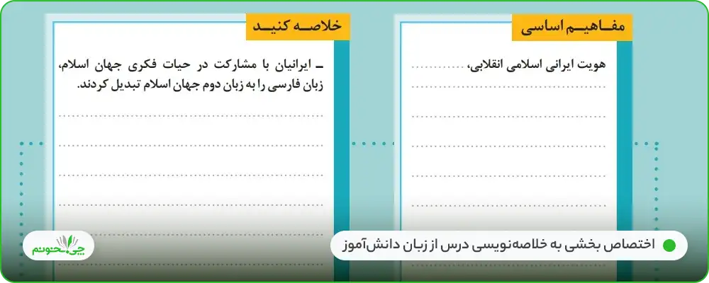 صفحه پایانی هر درس، شامل سه بخش خالی است که باید توسط دانشآموز، پر شوند؛ «مفاهیم اساسی»، «خلاصه کنید» و «آنچه از این درس، آموختیم». در این سه بخش، دانشآموز باید آنچه از درس آموخته را با زبان خود بازگو کند و به همین دلیل هم به عنوان مرحله آخر آموزش، میتواند نقش مهمی را در جاانداختن آموزشها برای دانشآموزان و مرور و جمعبندی راحتتر درس، بازی کند.